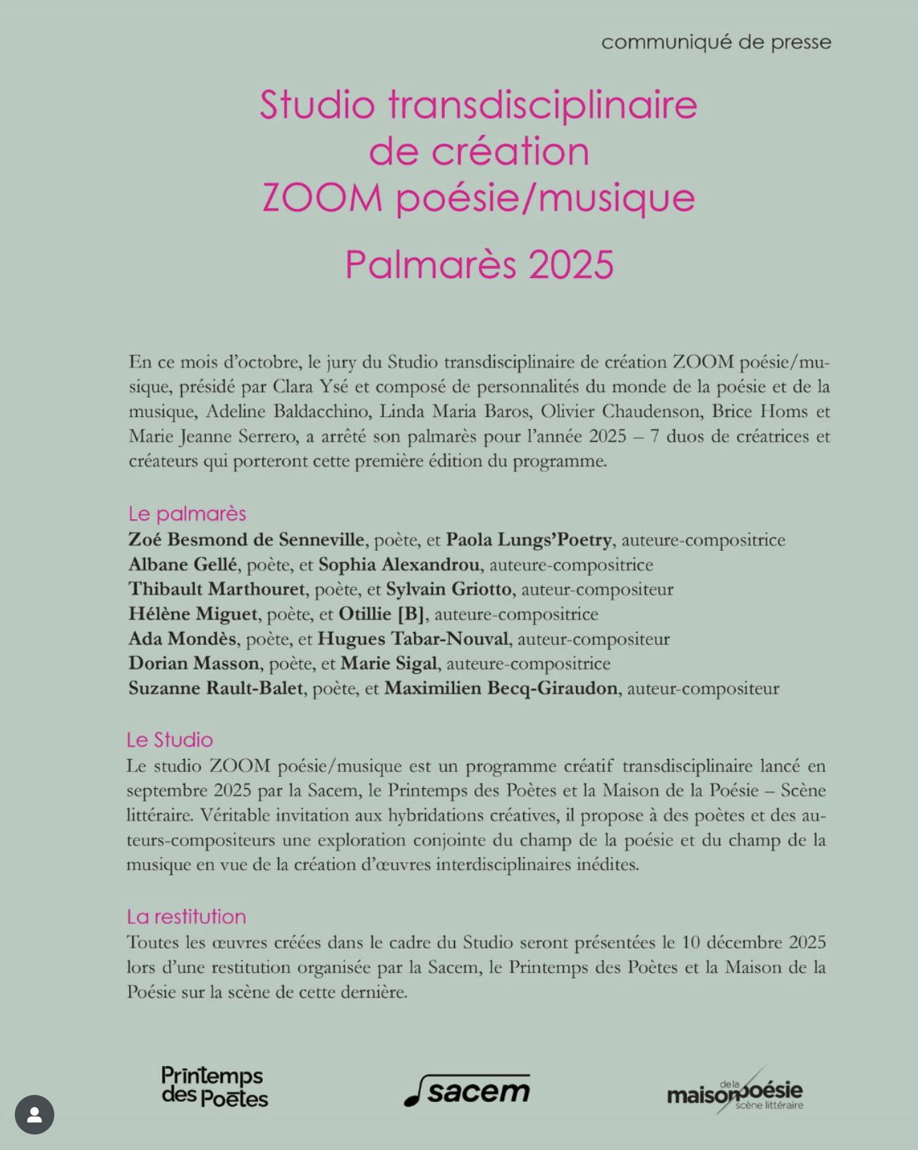 Chosen by a prestigious jury (Clara Ysé, Sacem, Maison de la Poésie…), I am one of 7 duos invited to create an original piece blending poetry and music, to be performed live in Paris on December 10th, 2025.